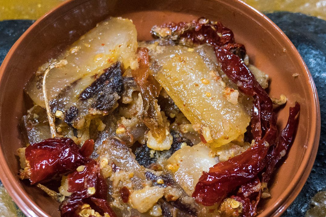 Phaksha Paa can be a gravy or a stew. Made using pork, Phaksha Paa includes a complex blend of spices and chilies and some mountain vegetables which are all cooked in oil or butter whereas pork is first stir-fried and then added to the dish. This is a staple Bhutanese dish which is also served with rice.